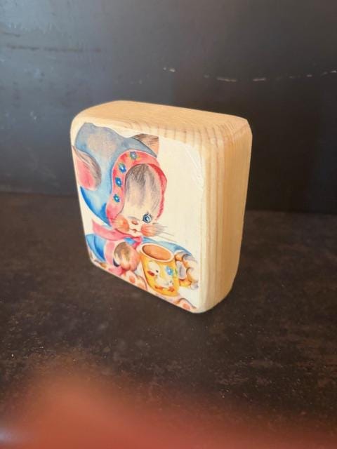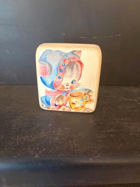 precious handmade vintage baby nursery decor; small wooden decoupage block with adorable vintage transfer
