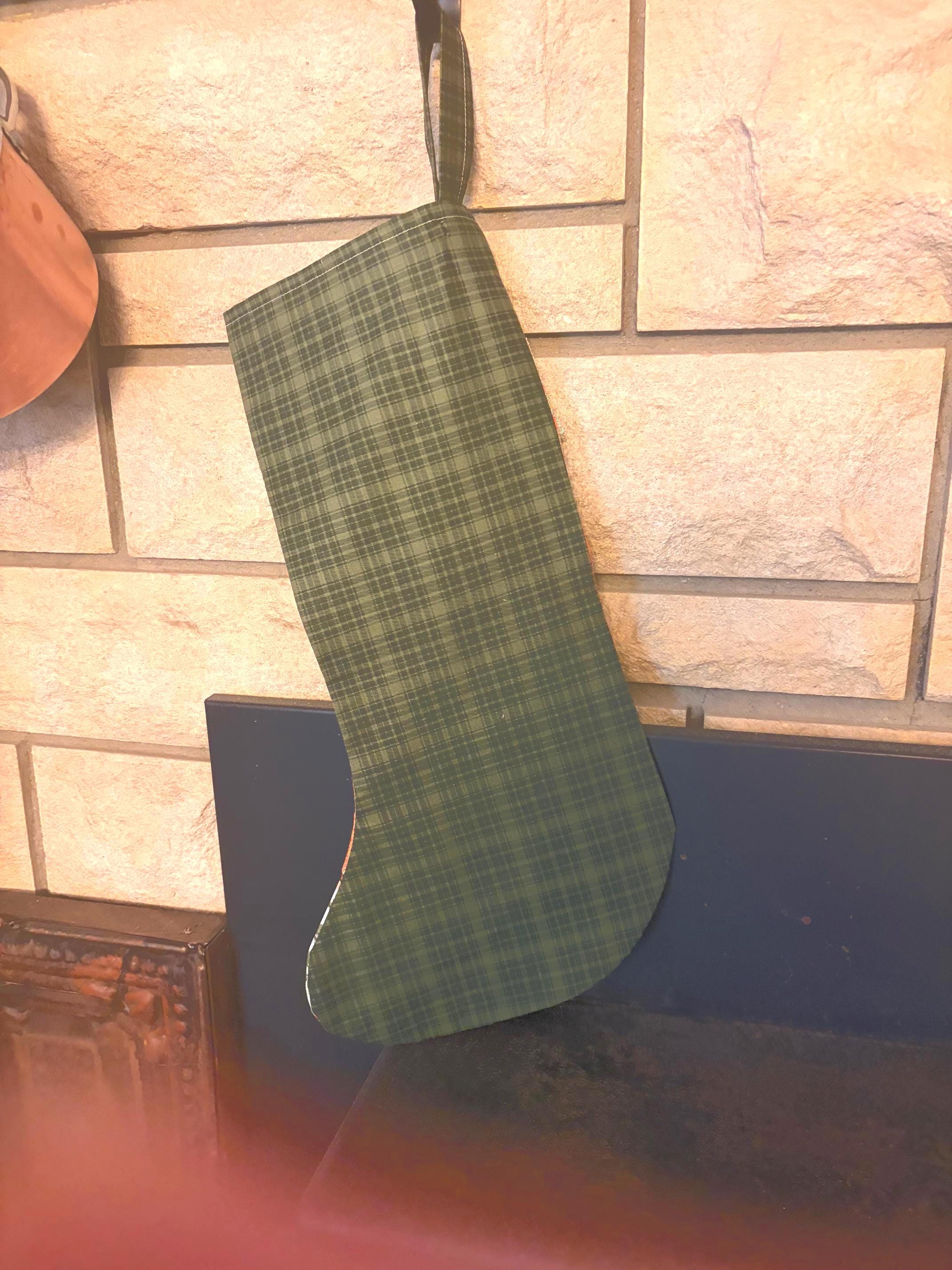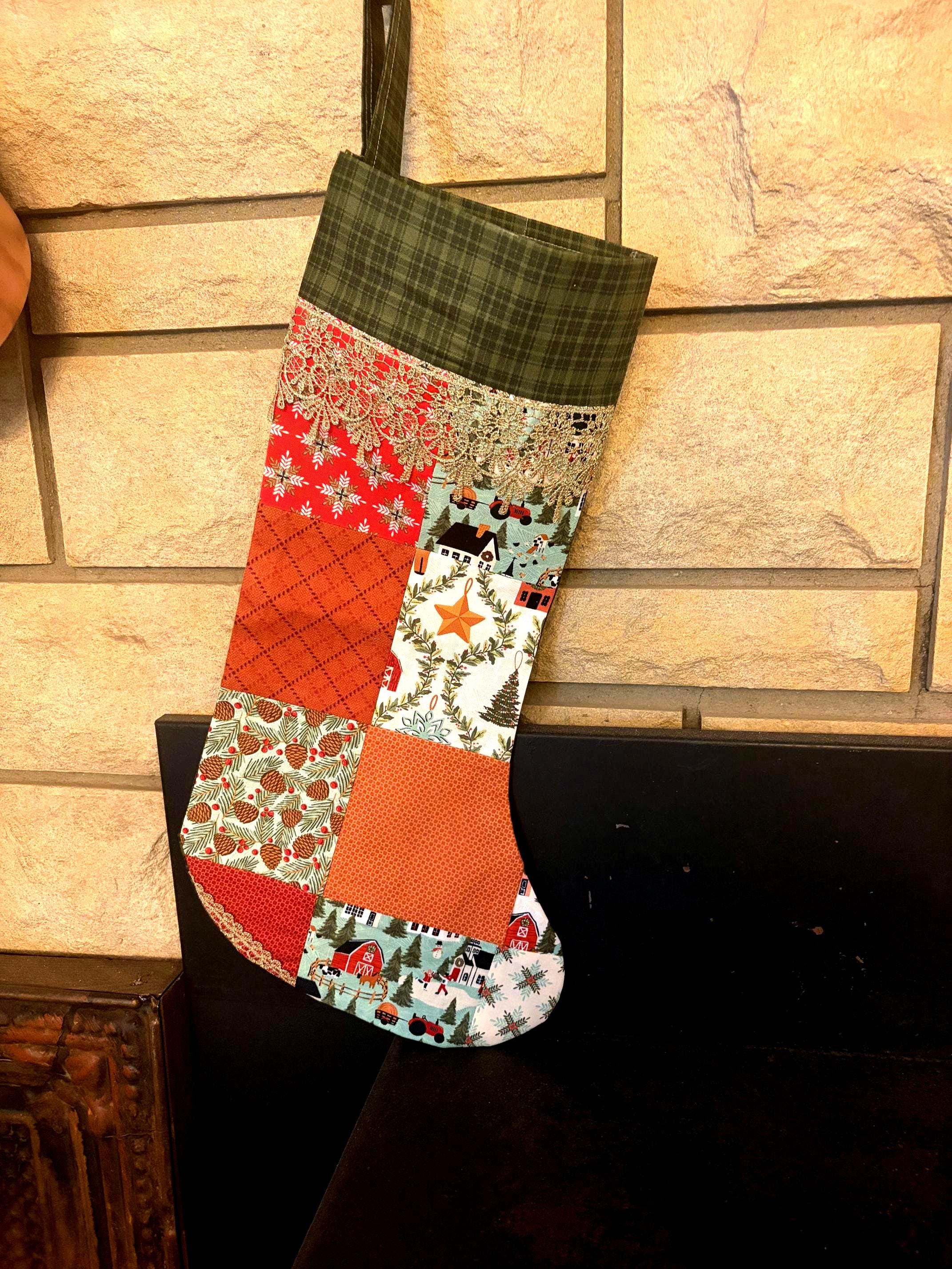 Homemade patchwork vintage inspired Christmas stocking detailed with antique gold lace