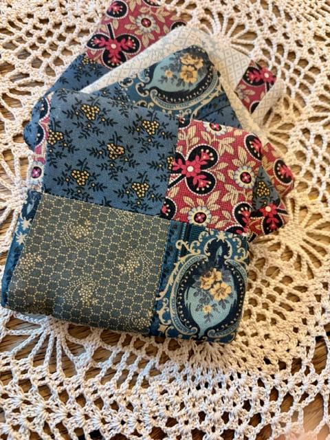 Beautiful hand sewn quilted coasters-set of four; Civil War reproduction print. Keeps furniture protected while giving a splash of color.