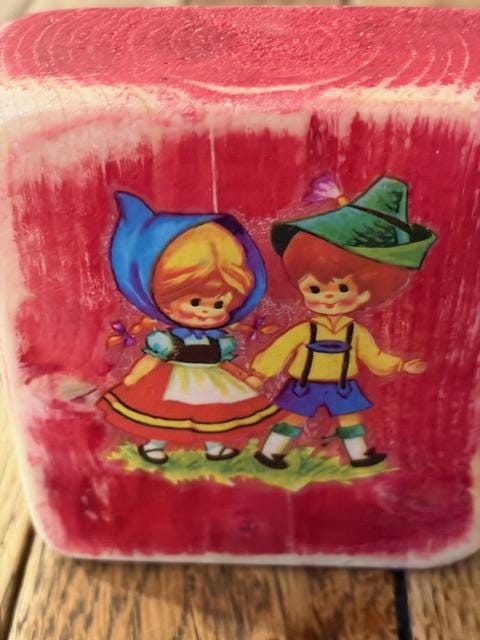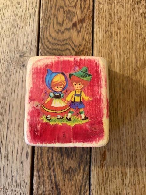 Jack and Jill went up the hill...this classic nursery rhyme is an adorable piece of decor to put on a shelf or dresser; decoupage surface with a distressed barnyard red finish. Perfect for a nursery or children's room