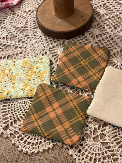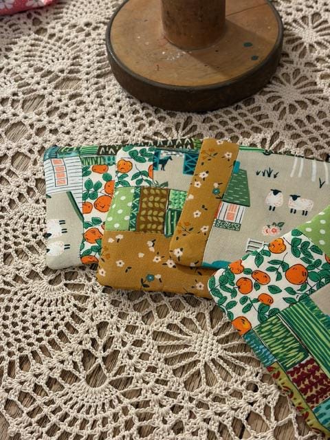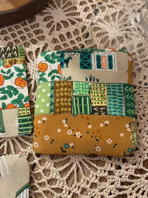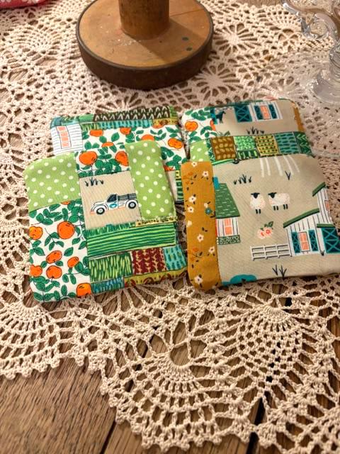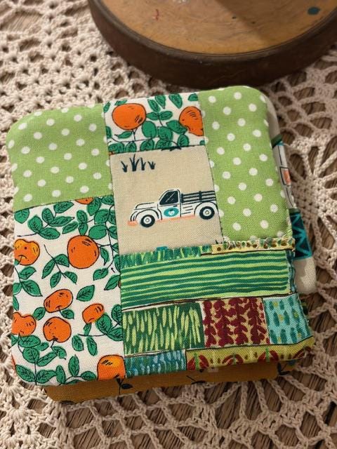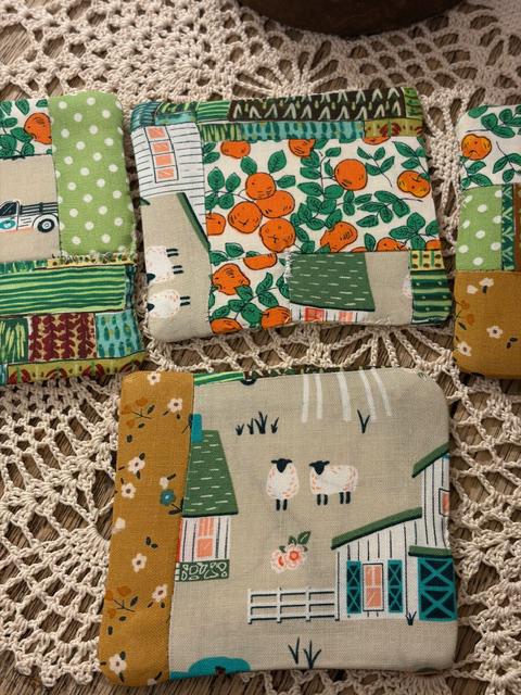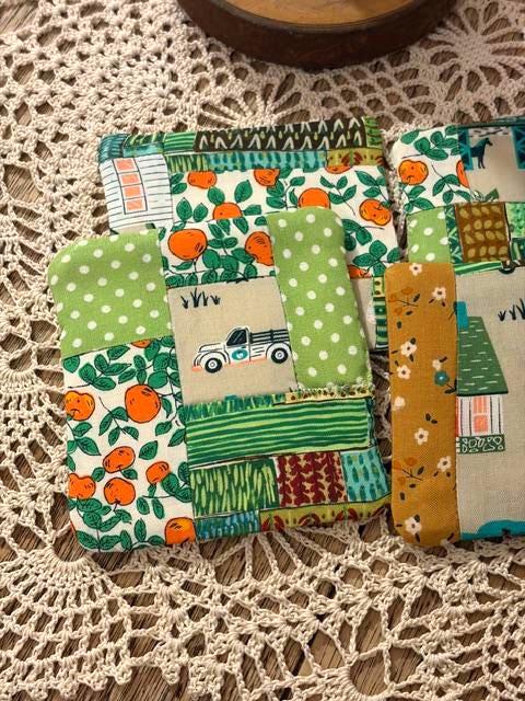Hand sewn, quilted, farmyard patchwork coasters: set of four. Horses, oranges, and old pick up trucks are just some of the images on these homestead style coasters. They are wonderful! 4.5" x 4.5" squares are perfect for any room-especially the kitchen or dining room table. Set of four. One of a kind patchwork pattern.