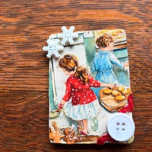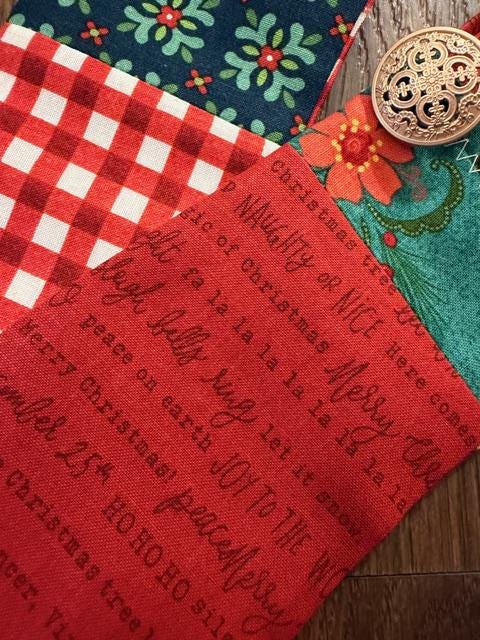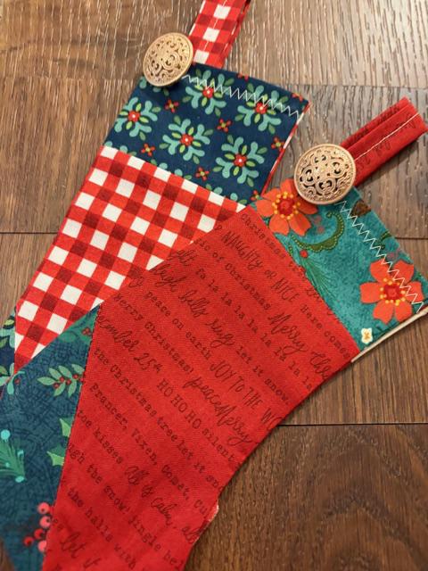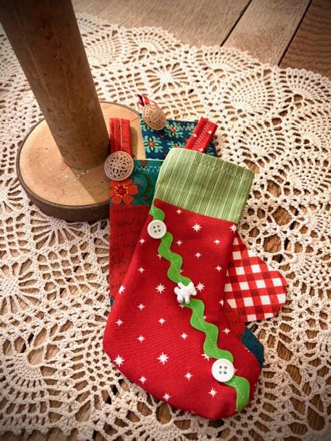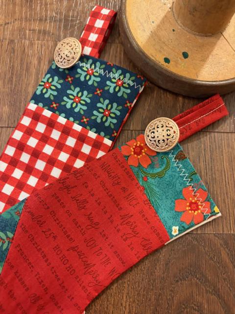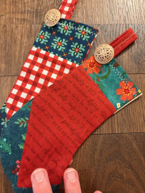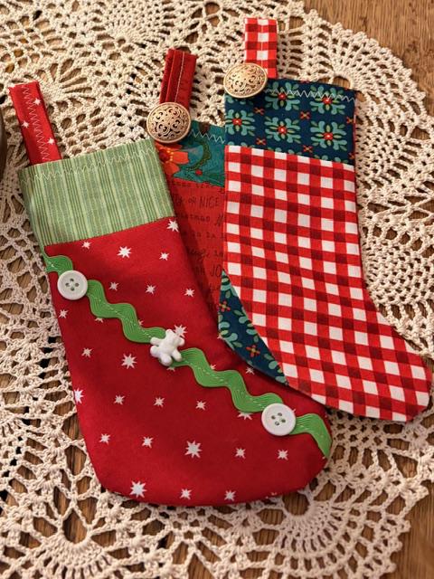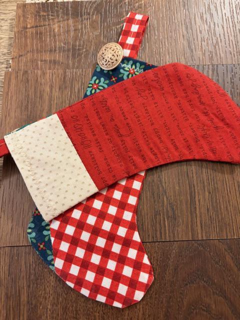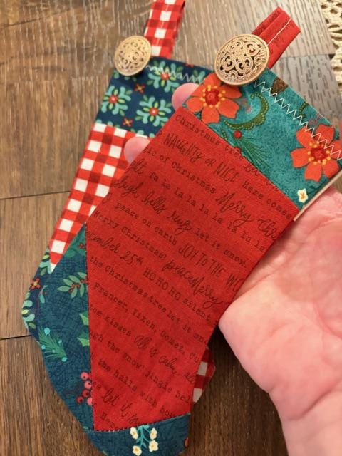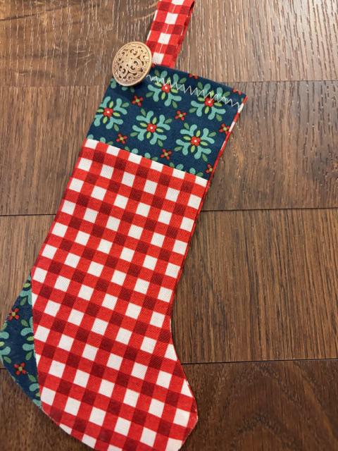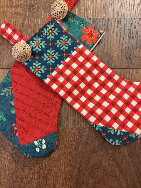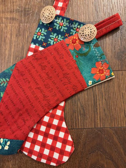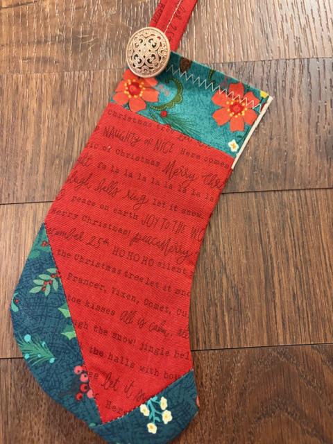 Hand sewn miniature patchwork stocking: Vintage inspired fabrics hand pieced together; adorned with vintage white or antique gold button. 7" x 3.5" Simply beautiful! Perfect for infants, children, and adults alike.