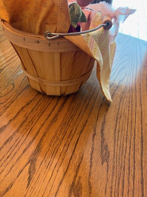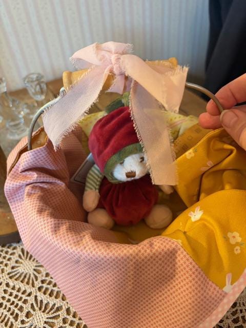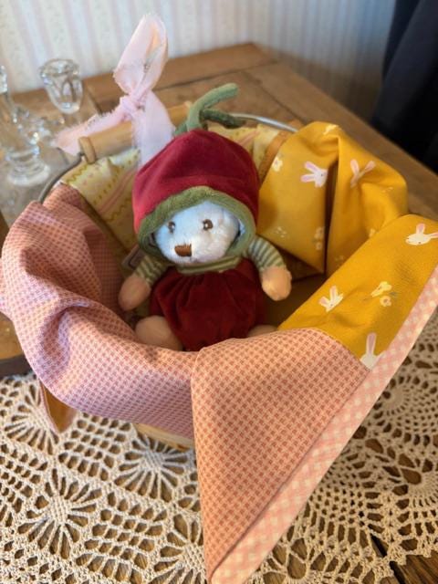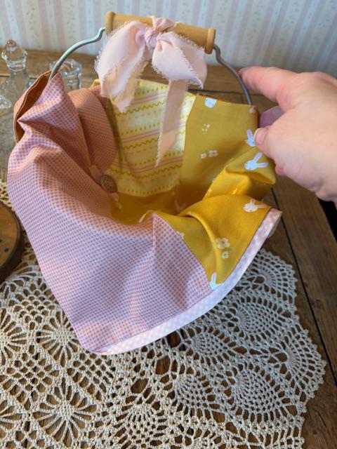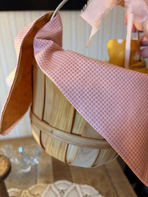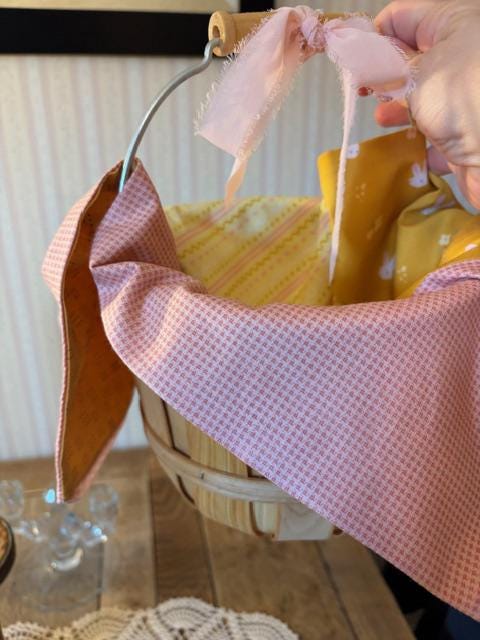 Hand deliver an Easter basket filled with goodies to a loved one with this basket and hand sewn patchwork liner. Vintage inspired fabric print adorned with antique gold button and plaid pink bias edging. Liner is 19" x 14" Chiffon pink ribbon bow tied on tip of berry bucker handle.