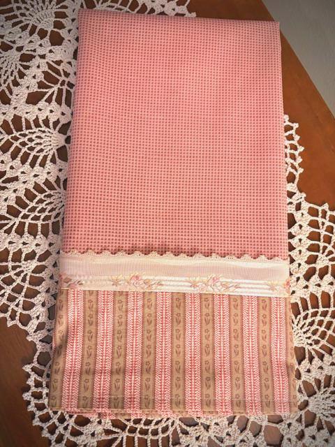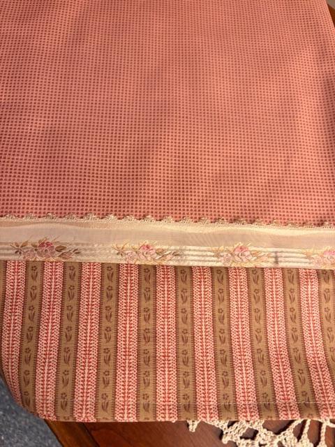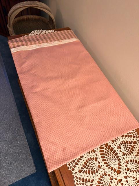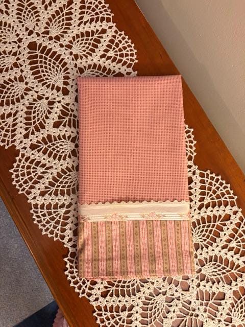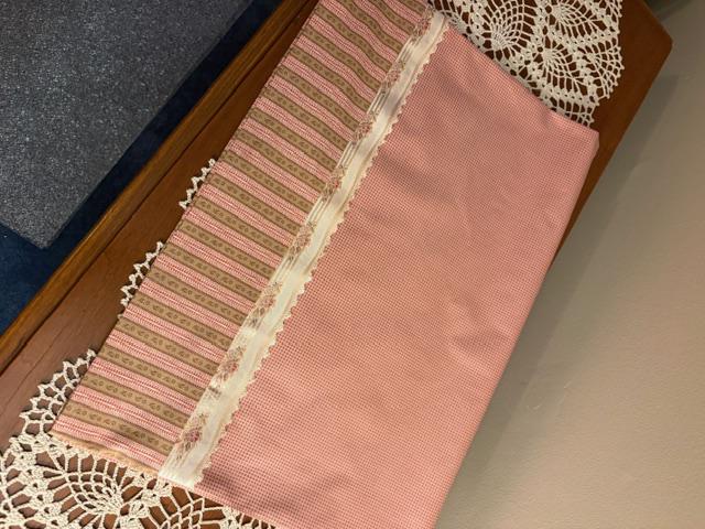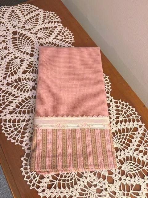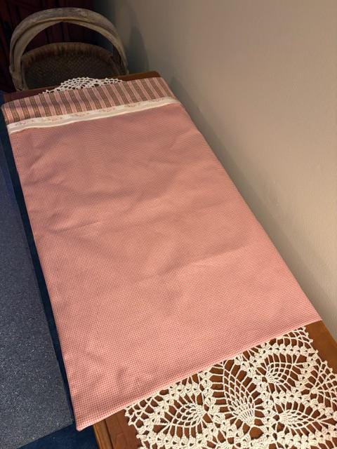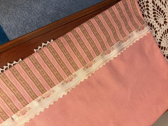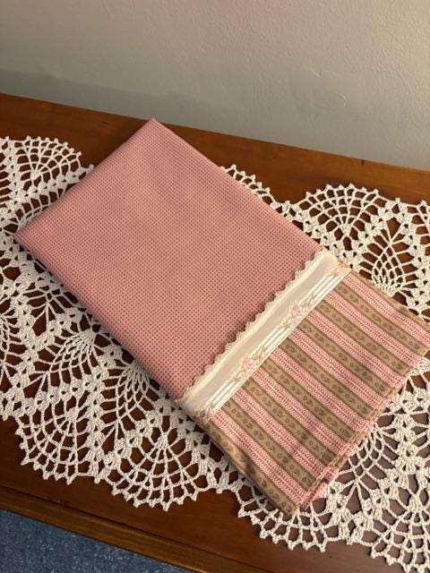 This pillowcase is made for a princess! Hand sewn Anne of Green Gables gingham pink fabric bordered with a gorgeous striped blush pink fabric; adorned with French vintage lace. Stunning look on a twin bed; beautiful drape off of pillow. Queen sized: Generously sized: 28" x 20" One pillow case; one of a kind