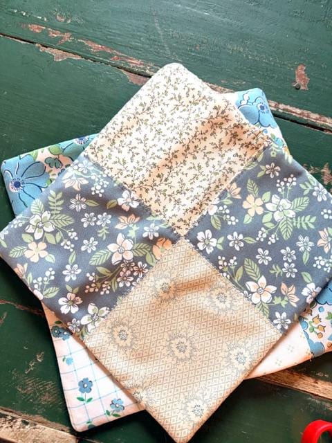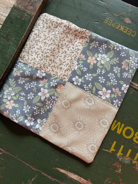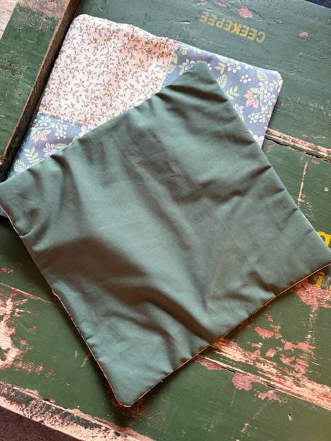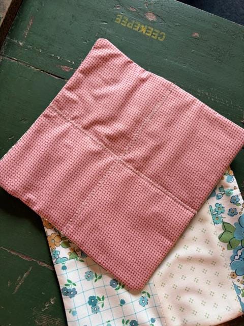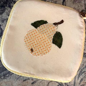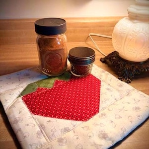 Scrappy Hot Pad-hand sewn; these pads are simple designs quilted with heat resistant batting and scraps from my sewing! Unique designs-each is one of a kind. 6.5" x 6.5" squares. Perfect to place a casserole or hot pan on. Simple and sweet. Sold individually. Not microwavable. Variations available upon request